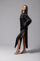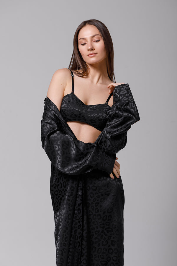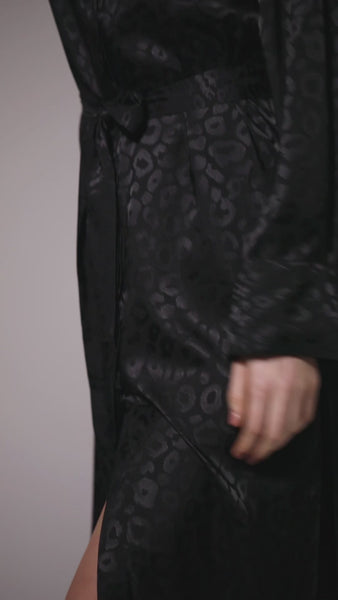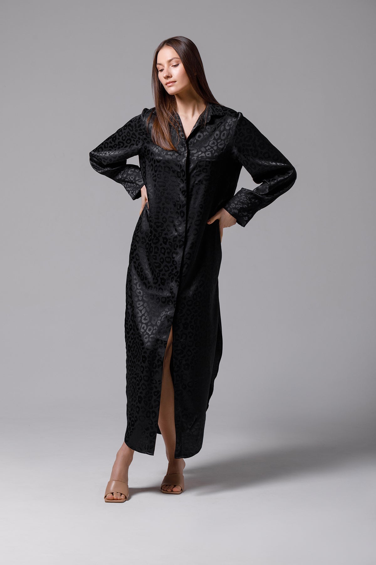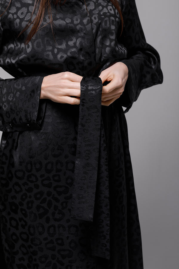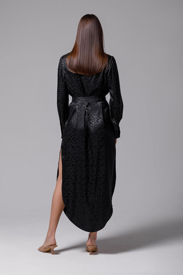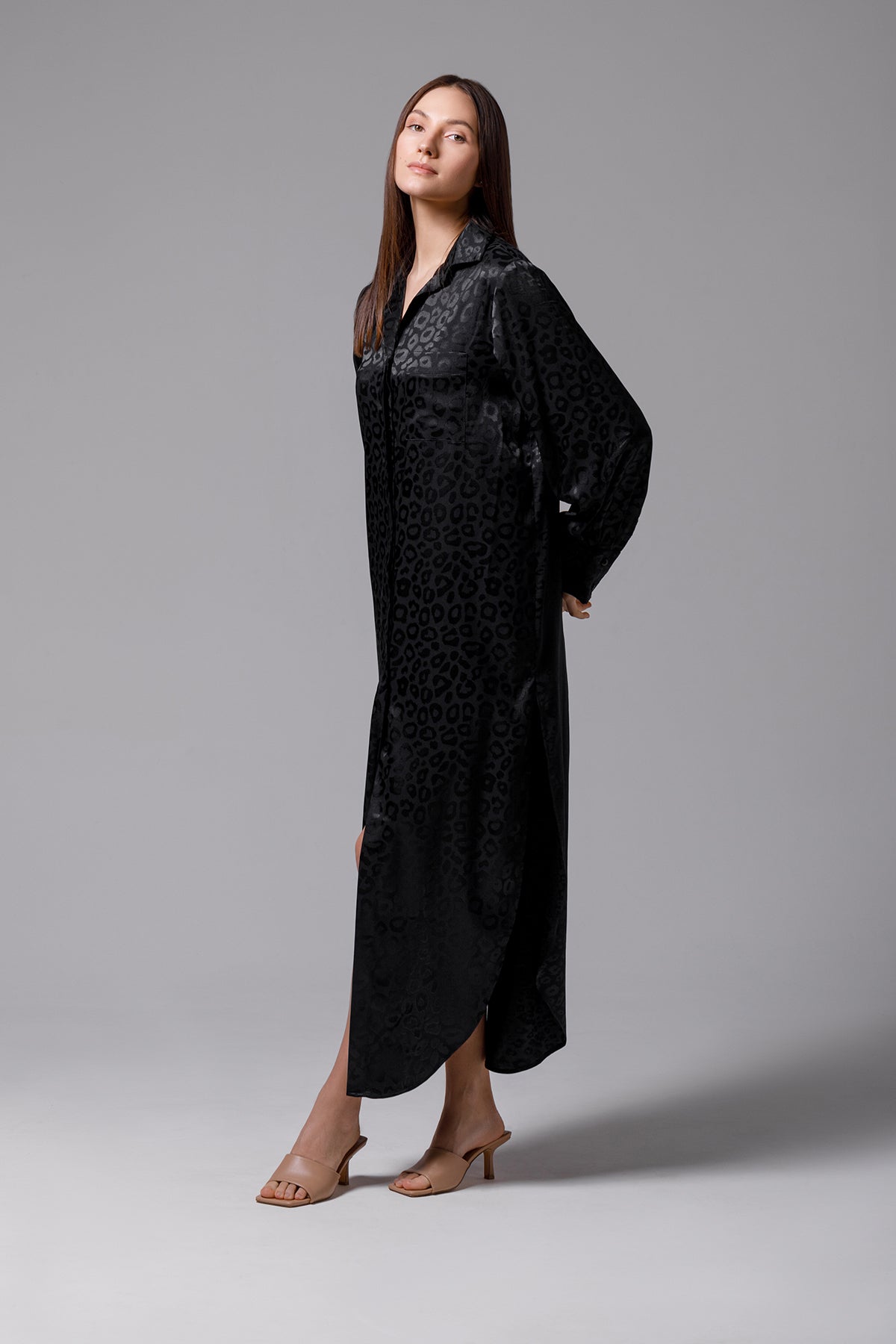 This maxi shirt dress in true black is simply irresistible. Made from ultra-soft satin materials, it's a pleasure to sleep in and enjoy its comfort during the day. This elegant shirt dress stretches all the way down and has a relaxed silhouette. With subtle details like button closures and a curved hem, it ties at the waist with a matching belt to highlight the beauty of your curves.