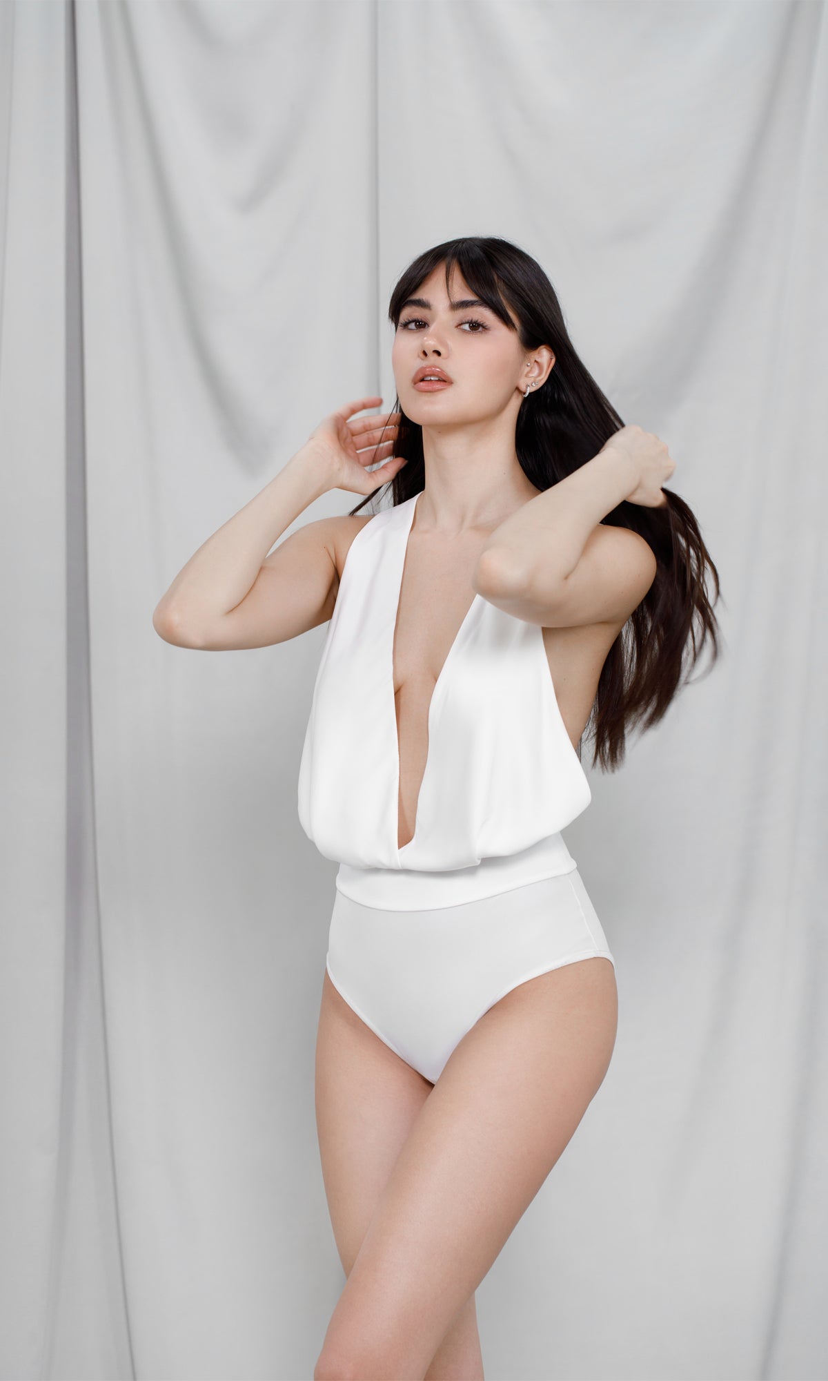Descoperă body-ul nostru din satin, o alegere de lux pentru momentele speciale. Cu cupele din mătase Ivory și chiloții din microfibră elastică, acest body emană eleganță și rafinament. Decolteul adânc și modern și spatele cochet, cu bretele răsucite, adaugă o notă seducătoare întregului ansamblu. Perfect pentru a fi purtat sub un blazer cu talie înaltă, acest body este alegerea ideală pentru a-ți evidenția frumusețea și feminitatea într-un mod subtil și sofisticat.