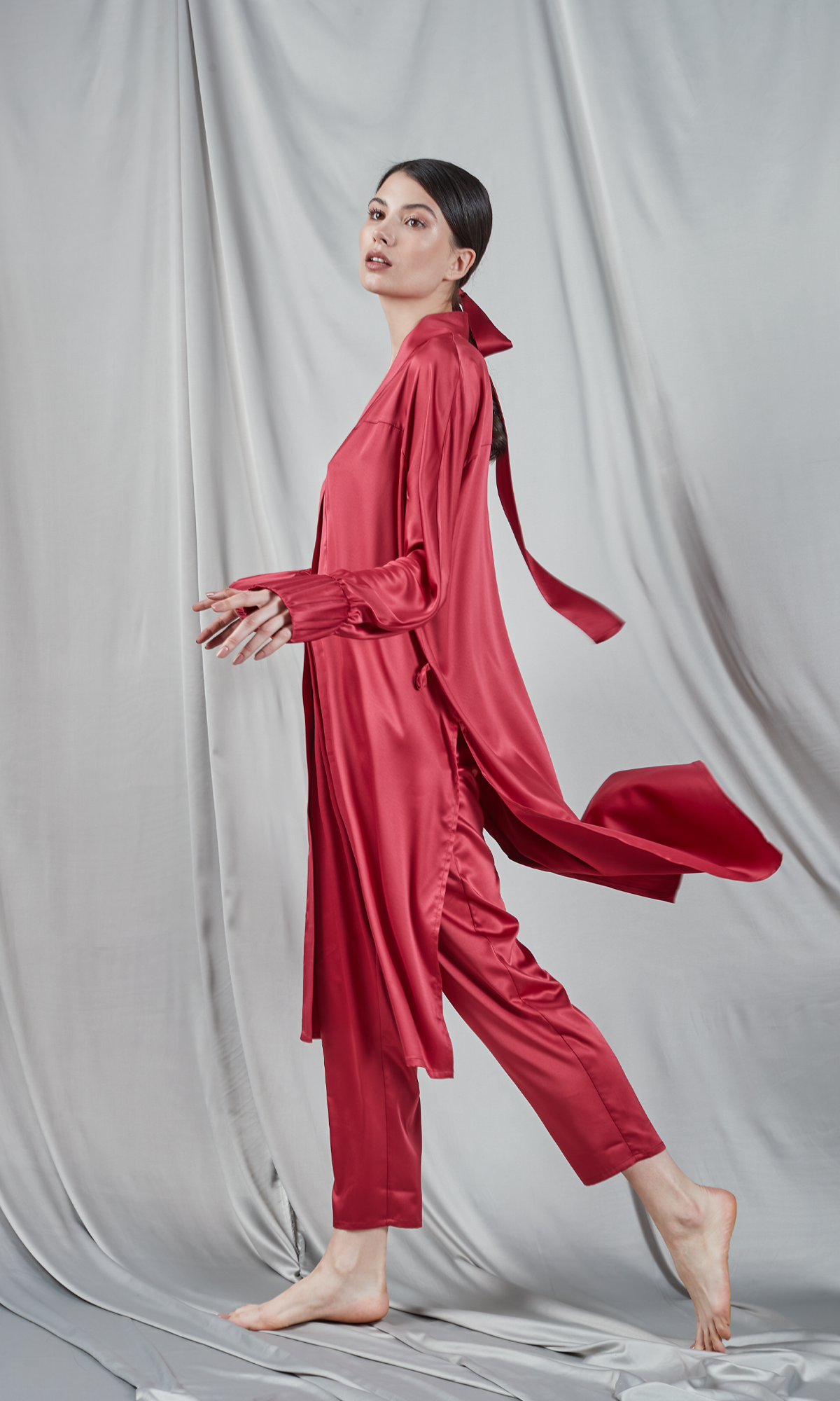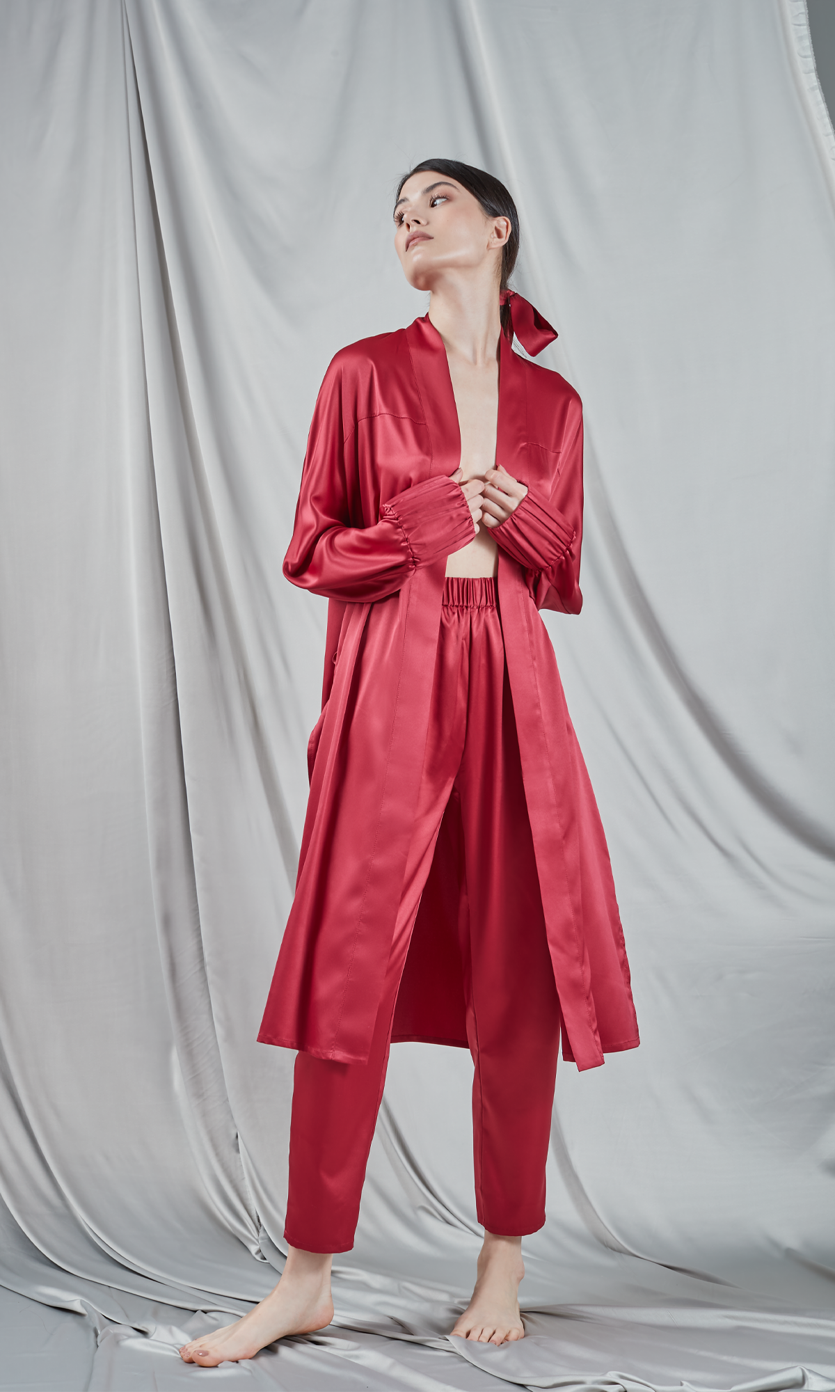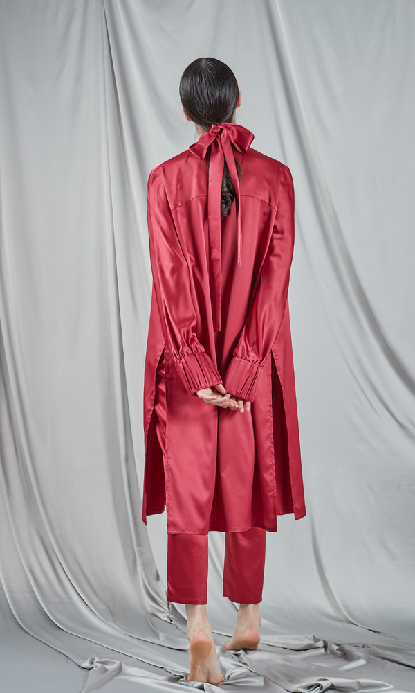 Pantalonii de tip palazzo, tăiați din satin de culoare roșu burgund. Au o talie înaltă, elastică, care asigură confort și o linie estetică plăcută. Croiul larg, fluid al pantalonilor creează o siluetă relaxată și elegantă, perfectă atât pentru ținutele de zi cu zi, cât și pentru cele mai speciale ocazii. Culoarea vibrantă și materialul de mătase adaugă un element de lux și sofisticare. Acești pantaloni sunt un statement de stil datorită nuanței bogate și texturii fine.