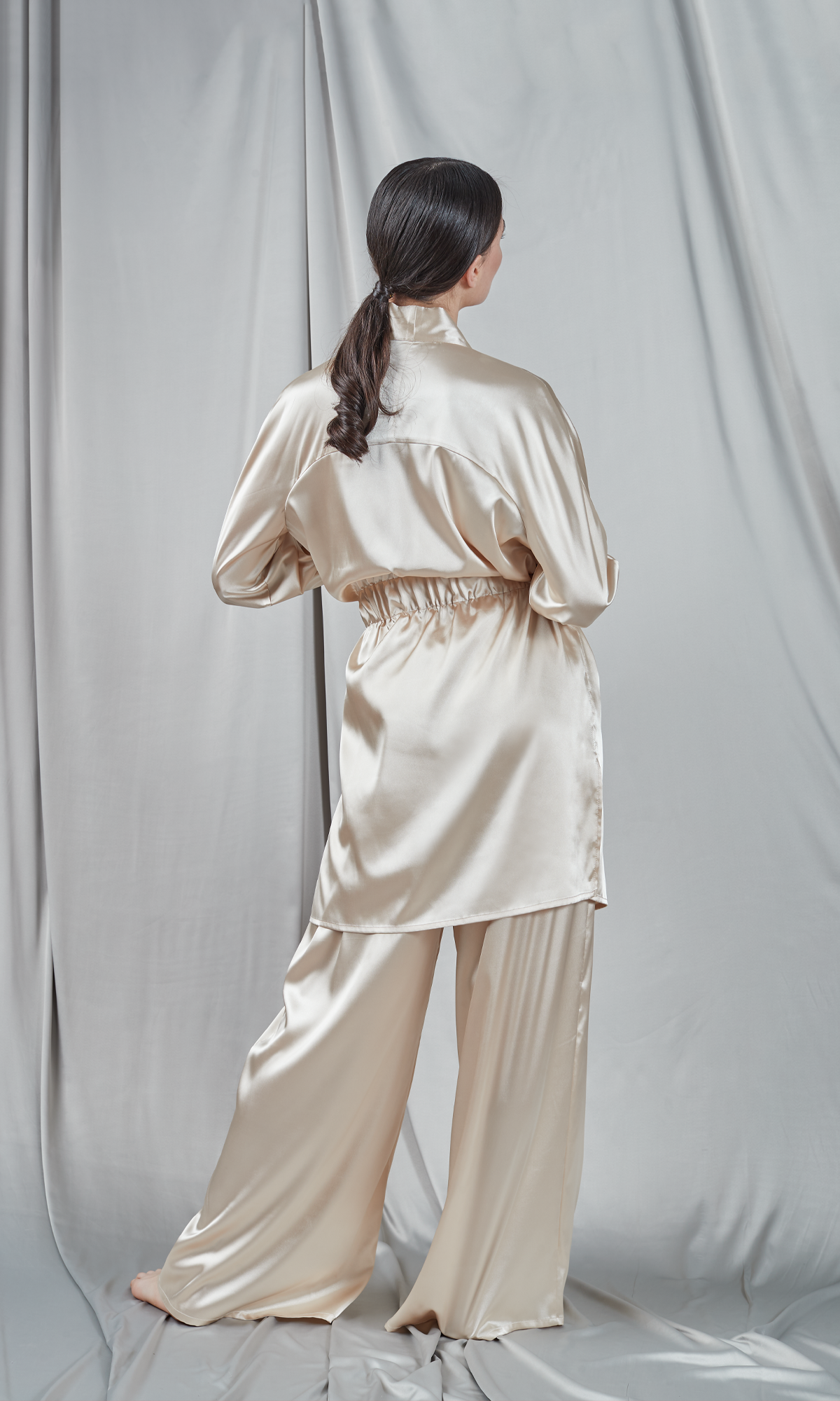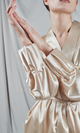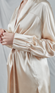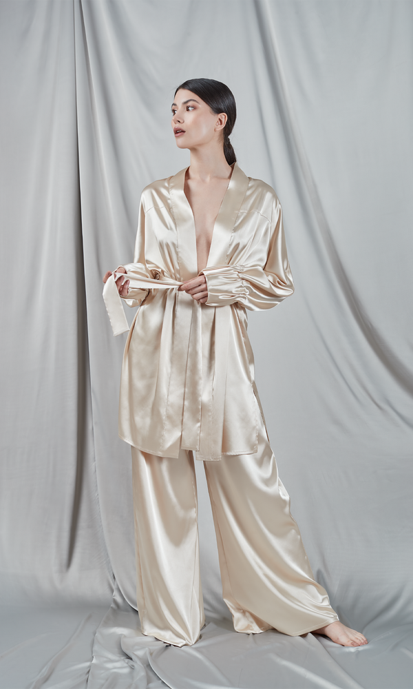 Kimono realizat din satin într-o nuanță strălucitoare champagne, având un aspect luxos și elegant. Are mâneci lungi, largi, care se termină într-un manșet comod și este prevăzut cu un cordon lat pentru a-l prinde în jurul taliei. Designul simplu și rafinat permite kimono-ului să cadă frumos peste corp, subliniind mișcările grațioase. Este o piesă versatilă ce poate fi purtată ca un articol de loungewear sofisticat acasă sau ca strat suplimentar de eleganță peste o ținută de seară. Finisajul satinat al mătăsii adaugă un plus de rafinament întregului look.