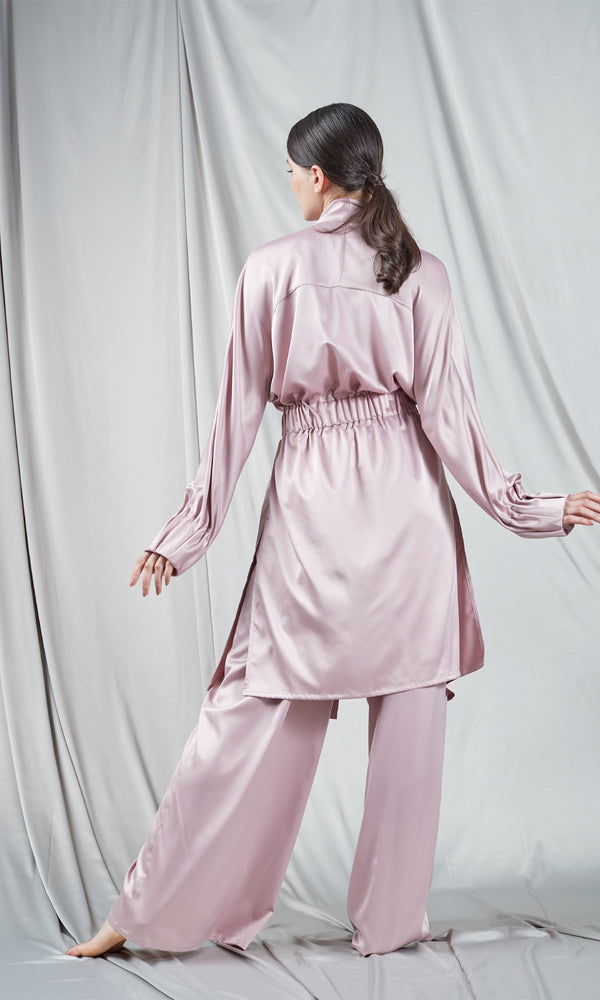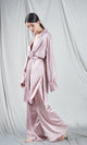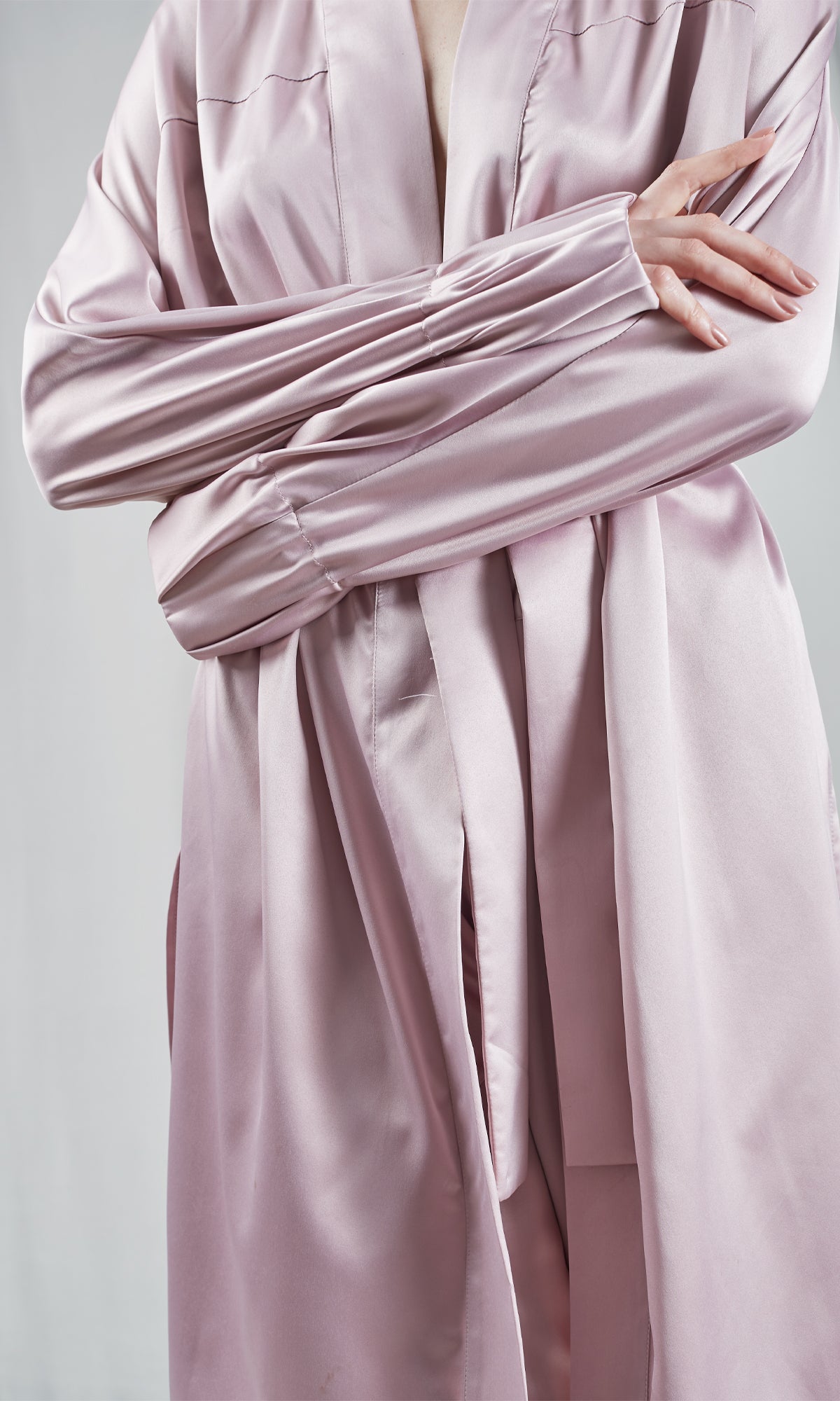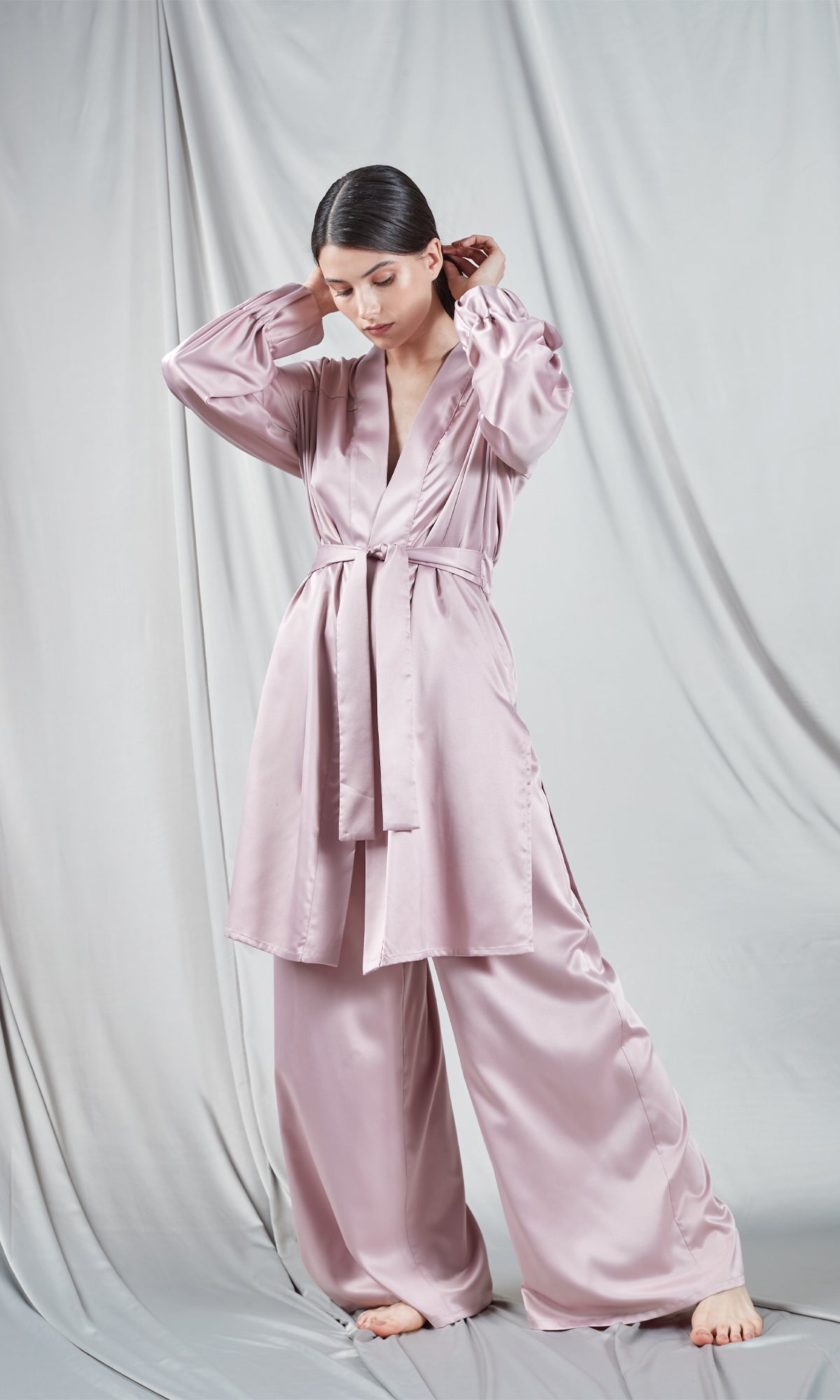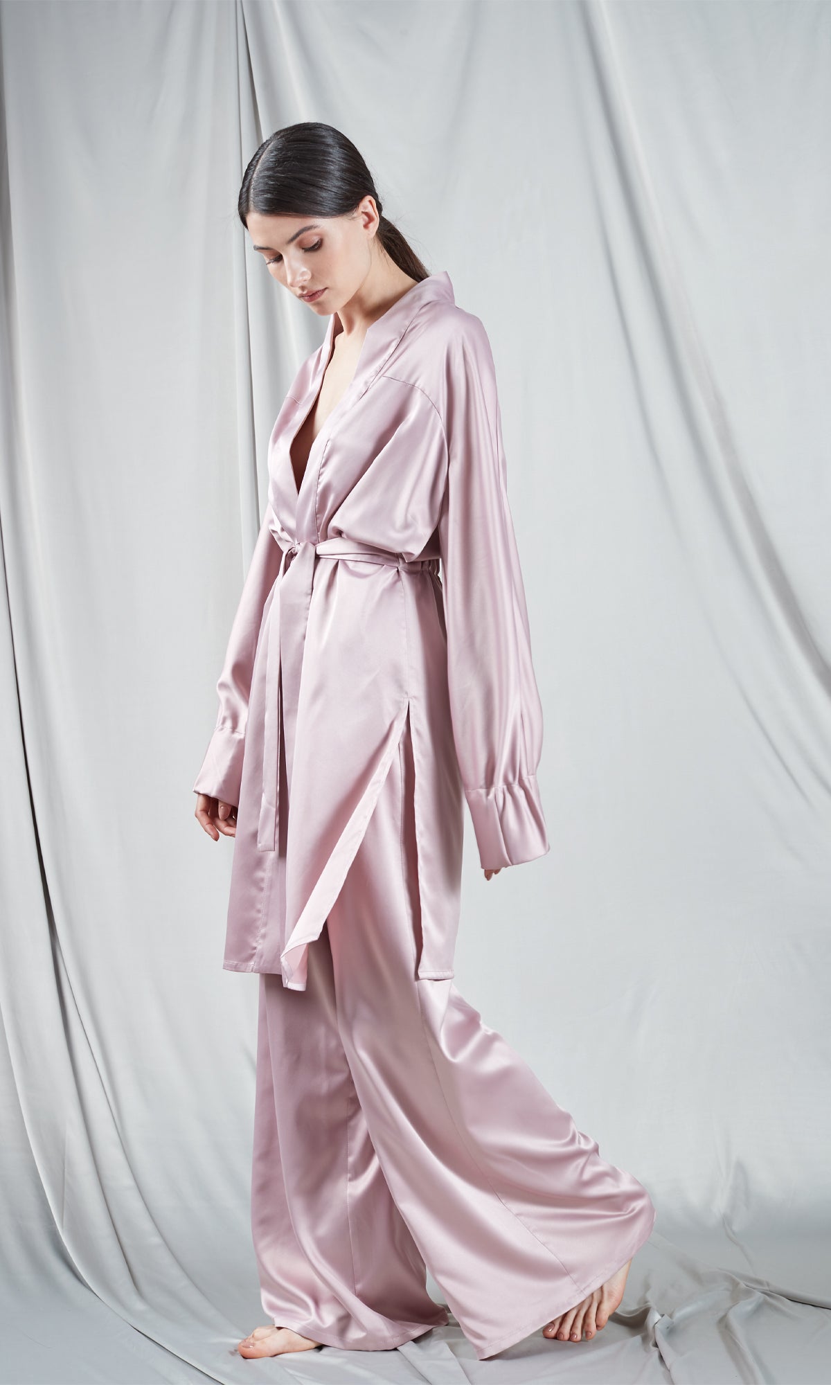 Kimono scurt de culoare roz pal, confecționat din mătase lucioasă. Kimono-ul are mâneci lungi, ample, și este accesorizat cu un cordon lat care poate fi legat în talie pentru a accentua silueta. Designul este simplu și elegant, cu o croială care fluează liberă, adăugând un sentiment de lux și confort purtătorului. Poate fi purtat în diverse contexte, de la loungewear la o piesă sofisticată pentru o ieșire seara. Textura satinată a mătăsii îi conferă o strălucire discretă și un aspect deosebit de plăcut la atingere.